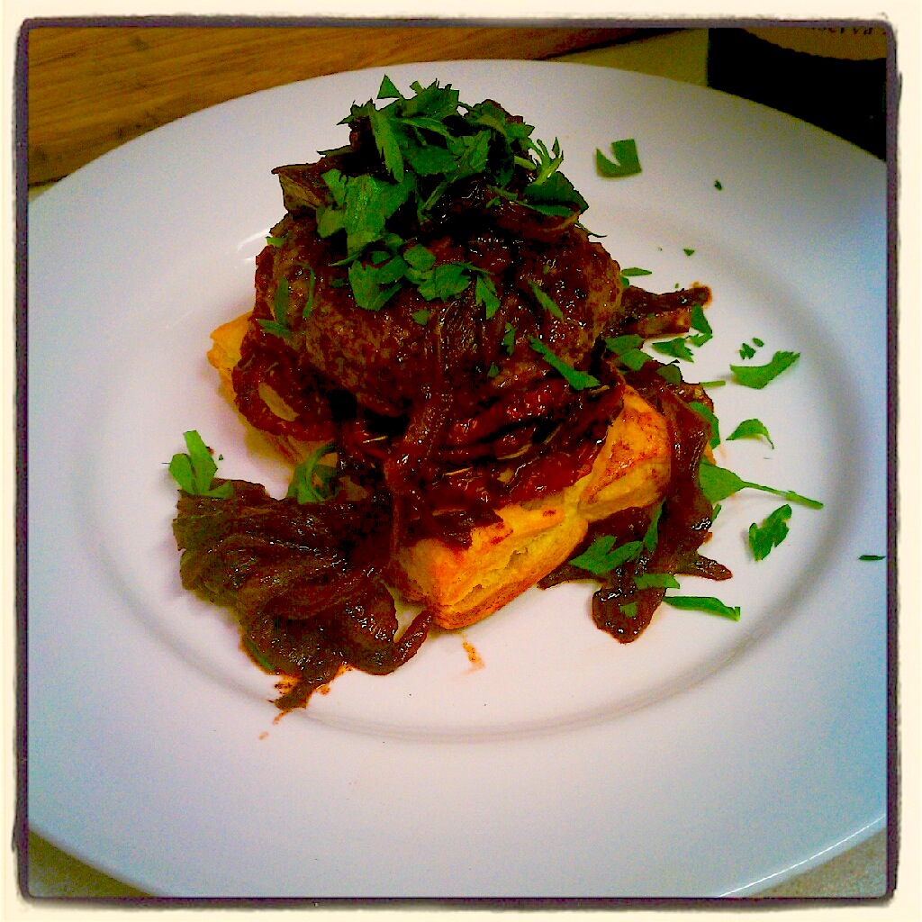 **Lamb Patties on Puff Pastry with Caramelized Onions and Slow Roasted Tomatoes