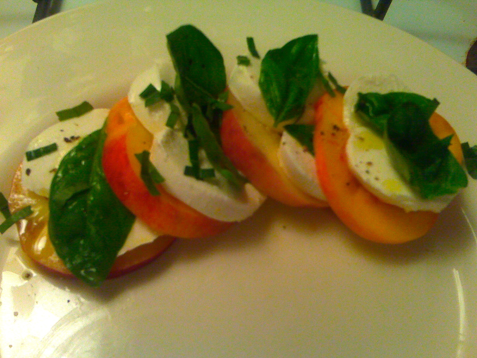 Velva-The peaches really go so well with the fresh mozz, it's a great substitution for when you're tired of all those tomatoes.