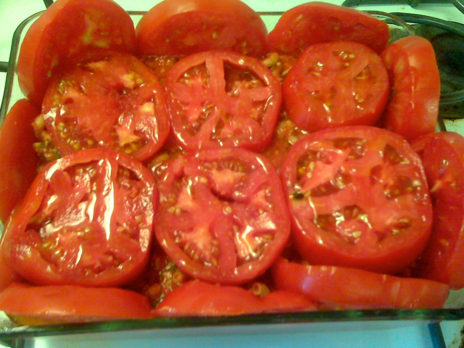 Butter a deep 9*9in glass baking dish and line it with thick slices of large, fresh tomatoes. Line the bottom and up all the sides.